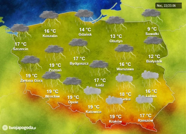 Dzień był jeszcze spokojny, ale noc zapowiada się niespokojnie. Najpierw na zachodzie, później w centrum, a na końcu na wschodzie kraju zacznie obficie padać, mocno wiać, a miejscami grzmieć. Uprzedzamy, że lokalnie zjawiska mogą być gwałtowne i powodować zniszczenia. Na zachodzie i południu noc będzie nie tylko deszczowa i burza, ale też bardzo ciepła i duszna, ponieważ termometry pokażą nie mniej niż około 20 stopni. Najchłodniej noc zapowiada się na północnym wschodzie, gdzie będzie poniżej 10 stopni... Dowiedz się więcej