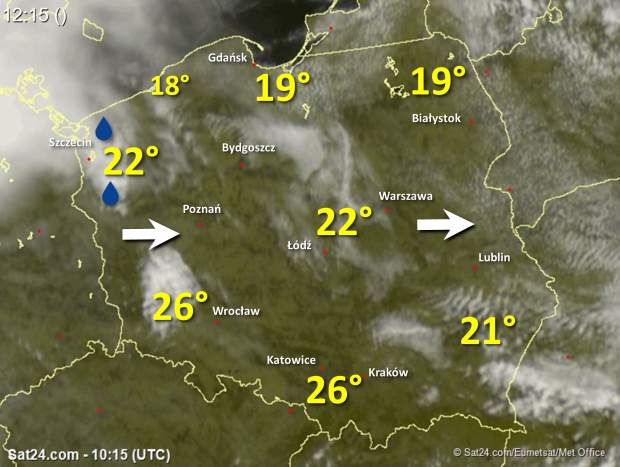 Godziny południowe są słoneczne, ale miejscami chmur przybywa. Poważniej zachmurzyło się na zachodnim Pomorzu, gdzie zaczęło padać. Na burze poczekamy jednak dopiero do późnego popołudnia. Wiatr wieje słabo i umiarkowanie z zachodu. Temperatura wynosi od 18 stopni nad morzem do 26 stopni na południu kraju.