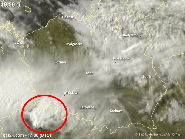 Na zdjęciu satelitarnym z godziny 19:00 widoczne jest rosnące zachmurzenie nad Polską. Jednak pomimo tego, że miejscami chmury wyglądają złowieszczo, to jednak ani błyskawic, ani deszczu nie przynoszą. Wyjątkiem jest tylko rejon Zatoki Gdańskiej, gdzie przelotnie pada, a także Sudety, gdzie przeszła gwałtowna burza, którą na poniższym zdjęciu satelitarnym oznaczyliśmy czerwonym okręgiem. Przyniosła ona ulewy i wichury również w całym północnych Czechach.