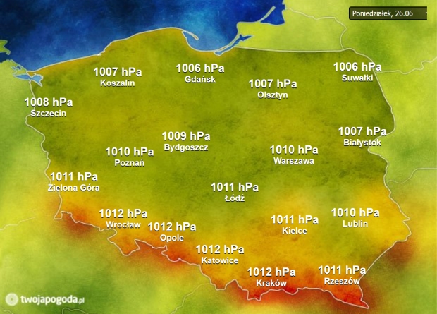 Ciśnienie będzie się nieznacznie wahać, jednocześnie powoli rosnąc. W tej chwili barometry pokazują od 1006 hPa (lekko obniżone) na północy do 1012 hPa (w normie) na południu.