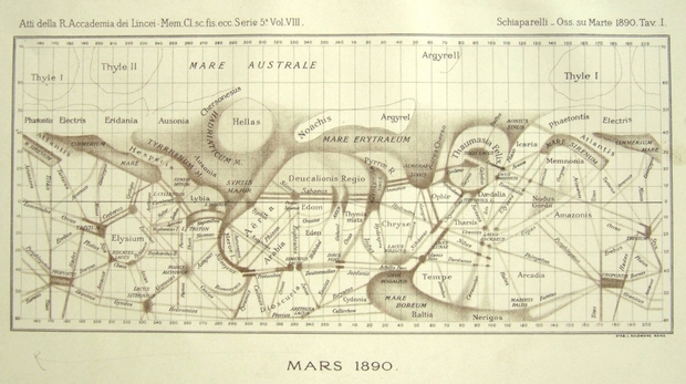 Giovanni Schiaparelli, włoski astronom, jako pierwszy w historii stworzył atlas Marsa. Powstał on za sprawą obserwacji teleskopowych już w 1890 roku. Schiaparelli myślał, że jasne obszary na powierzchni Marsa, które odbijają najwięcej światła, to kontynenty. Z kolei te ciemniejsze, to morza. Zaobserwował charakterystyczne proste linie, które według niego miały być kanałami. Dzisiaj wiemy, że było to tylko złudzenie optyczne, ale potwierdziły to dopiero w 1965 roku zdjęcia z sondy Mariner-4, 55 lat po śmierci Schiaparellego. Na jego cześć nazwano jeden z marsjańskich kraterów.
