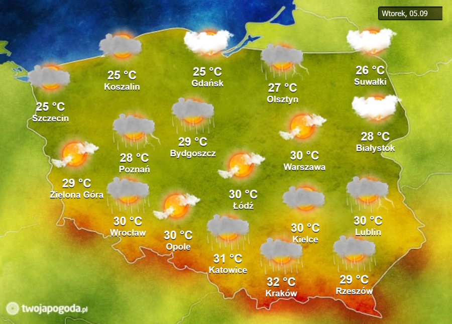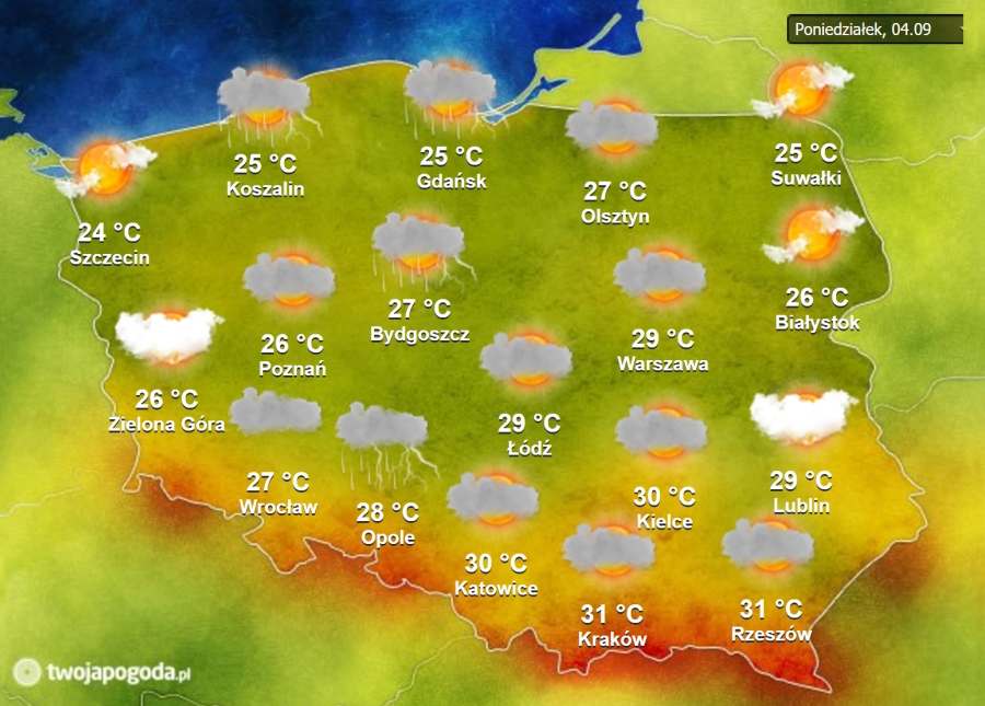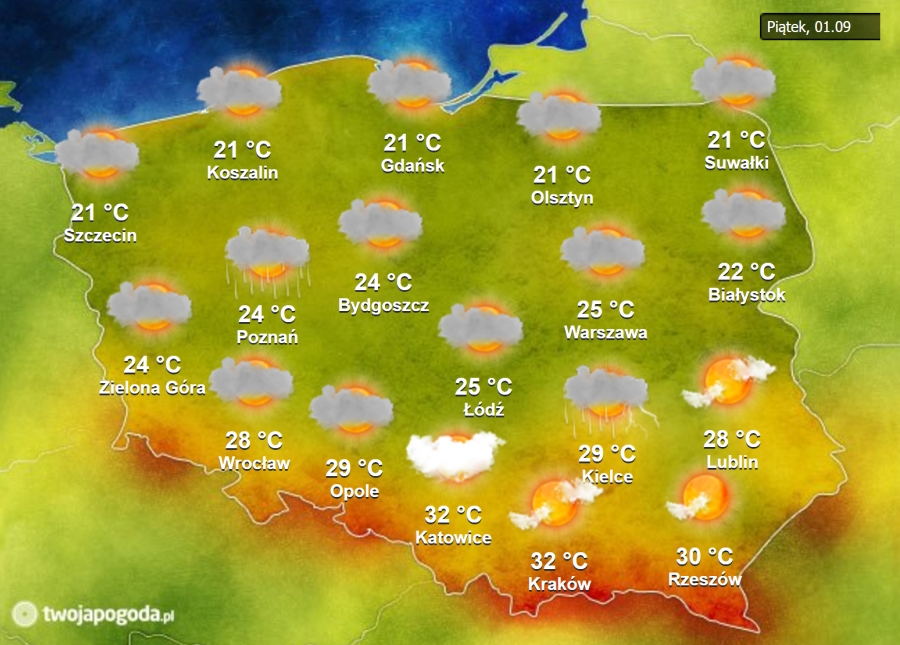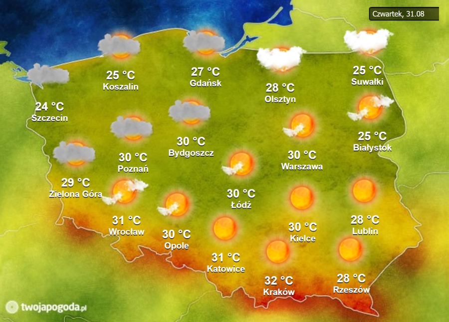 Ostatni dzień sierpnia z upałem powracającym do południowych i centralnych regionów. Tam termometry przy pogodnym niebie wskażą do 32 stopni. Na północy, gdzie chmur będzie więcej, temperatura też będzie wysoka, ale miejscami nie przekroczy 25 stopni.