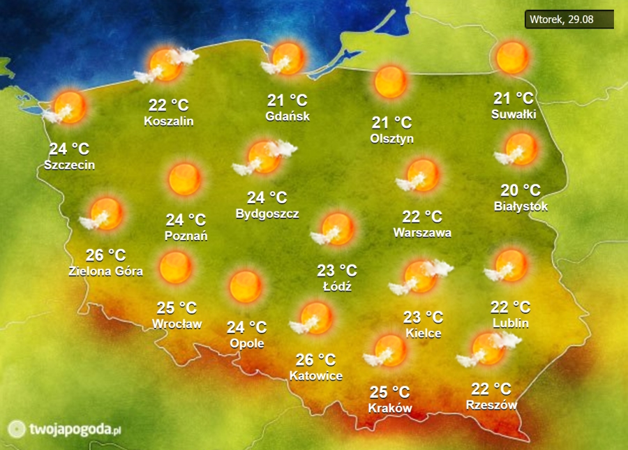 Zapowiada się naprawdę piękny wtorek z błękitnym niebem i temperaturami między 20 a 25 stopni, czyli w sam raz, jak na koniec sierpnia.