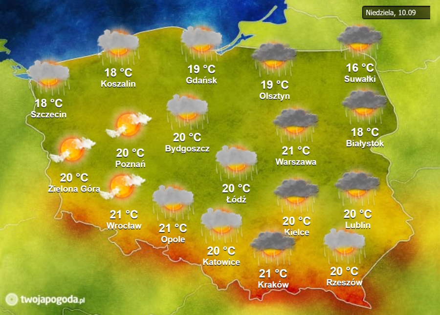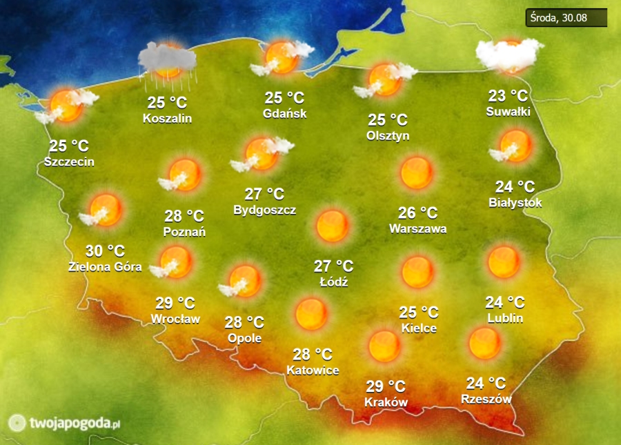 Od zachodu zacznie wkraczać front, który przyniesie opady, a co za tym idzie, także spadek temperatur. Jednak na większym obszarze Polski utrzyma się słoneczna i gorąca pogoda.