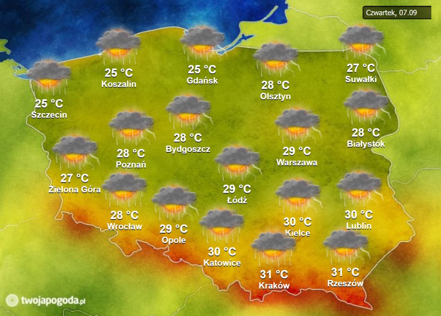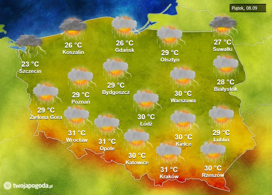 Pierwszy dzień roku szkolnego gorący, ale miejscami parny i duszny, ponieważ może przelotnie popadać i zagrzmieć. Mimo, że poniższa mapa nie wszędzie pokazuje burze i opady, to jednak musimy się liczyć, że może być ich więcej i to na większym obszarze kraju.