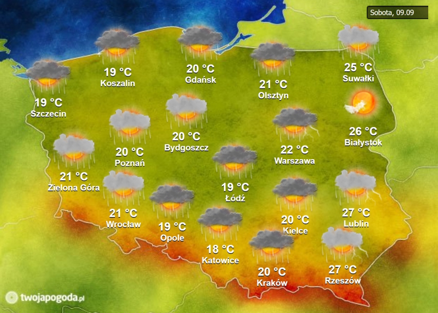 Na weekend aura zmieni się, po przejściu chłodnego frontu temperatura wyraźnie spadnie, przeważnie o 10 stopni. Nadal może padać i grzmieć, zwłaszcza na wschodzie, gdzie jeszcze utrzyma się gorące powietrze.