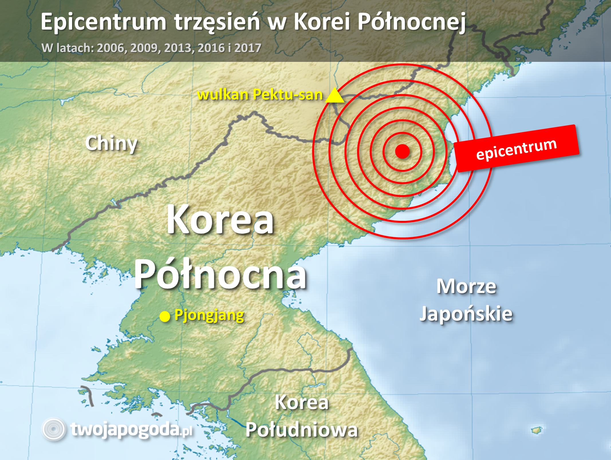 Epicentra wstrząsów spowodowanych przez testy jądrowe.Według naukowców siła wstrząsu świadczy o tym, że odpalono ładunek o mocy 100 kiloton i był on dotąd największym użytym przez Koreę Północną. Również siła wstrząsu była jak dotychczas najpotężniejsza. Drżenie ziemi można było poczuć nie tylko w całej północnej części Korei Północnej, ale także na przyległych obszarach Chin i Rosji, w tym m.in. we Władywostoku.
