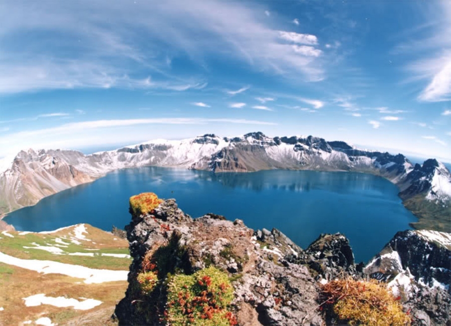 W kraterze wulkanu znajduje się Jezioro Niebiańskie, które ma powierzchnię 9 kilometrów kwadratowych, objętość 2 kilometrów sześciennych, a jego głębokość sięga 373 metrów. Kaldera w której znajduje się jezioro, powstała podczas gigantycznej erupcji w 969 roku, która osiągnęła siódmy, przedostatni, punkt w Indeksie Eksplozywności Wulkanicznej (VEI).