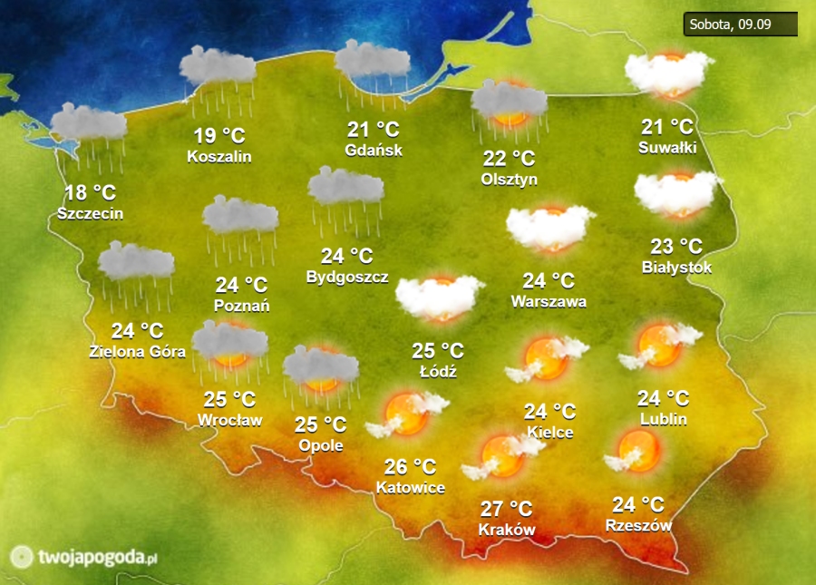 Sobota (9.09) będzie ciepła, a nawet bardzo ciepła, ponieważ na południu i w głębi kraju termometry po południu pokażą nawet około 25 stopni, a może i więcej. Do południa popadać może tylko na Pomorzu, poza tym będzie słonecznie i sucho.