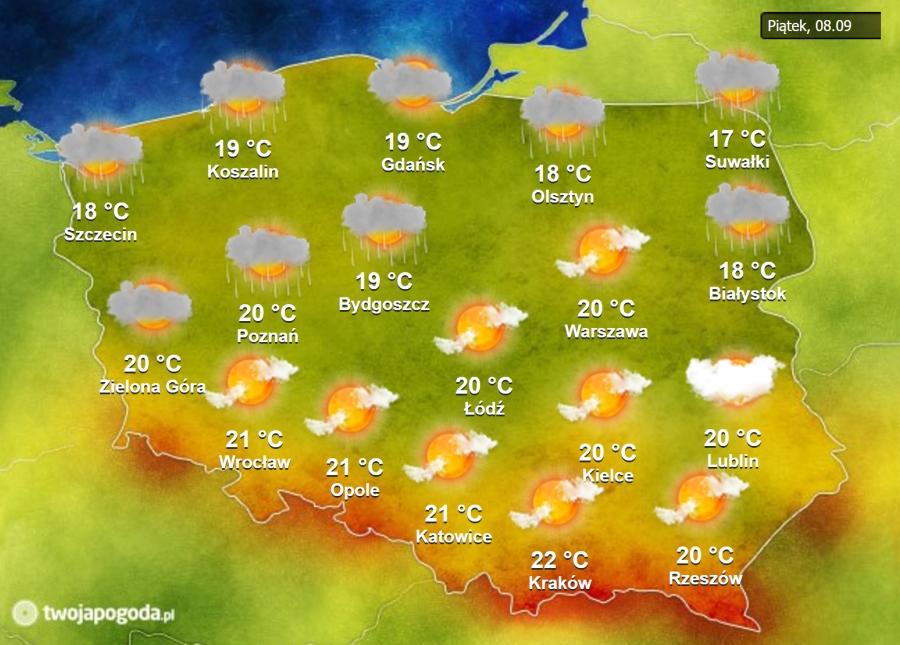 Z każdym kolejnym dniem opadów powinno być coraz mniej, a to oznacza, że niebo coraz częściej będzie się przecierać ujawniając słoneczko, które w wielu regionach Polski ostatnio widoczne było 5 dni temu. Będzie też coraz cieplej. Już w piątek (8.09) w całym kraju termometry pokażą powyżej 20 stopni. Popadać jeszcze może na północy, północnym zachodzie i północnym wschodzie. Najcieplej i najpogodniej będzie na południu.