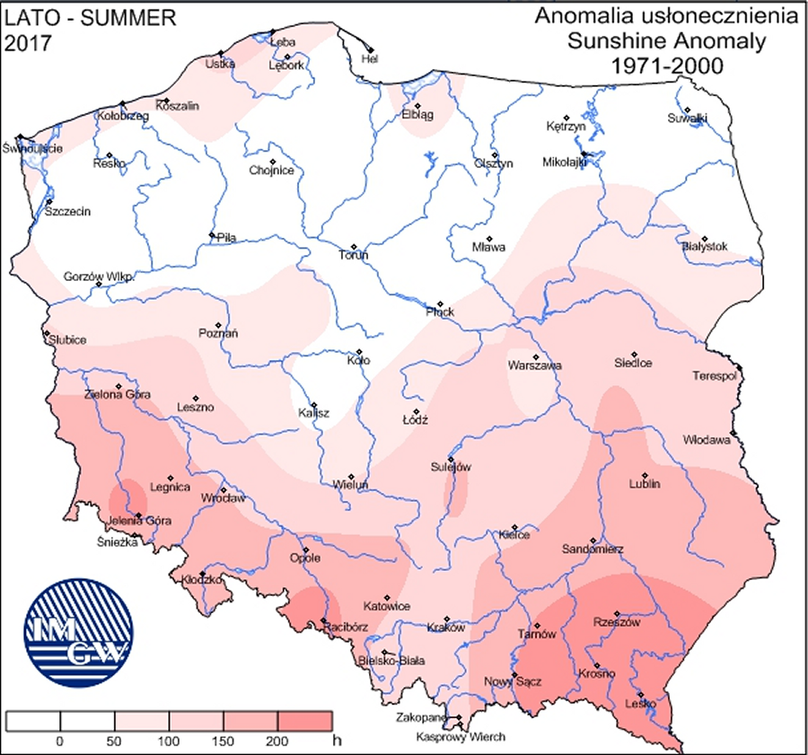 Anomalie sumy opadów latem 2017 roku. Dane: IMGW-PIB.Na najwięcej słonecznych godzin mogli liczyć mieszkańcy i wszyscy wypoczywający na południu kraju. Anomalia wyniosła tam nawet dodatkowe 200 godzin usłonecznienia. Na północy usłonecznienie oscylowało w granicach normy z wielolecia.