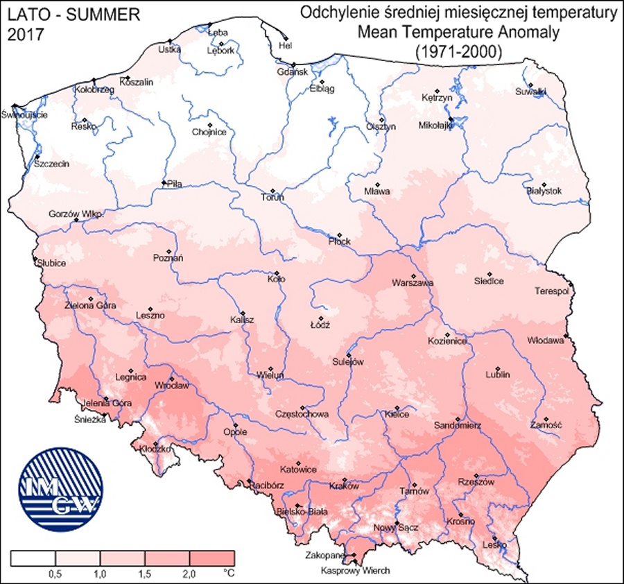 W północnej części kraju lato, a więc okres od 1 czerwca do 31 sierpnia, zapisało się w pobliżu normy wieloletniej. Im dalej na południe kraju, tym było ono cieplejsze wobec normy. Zdecydowanie najcieplej było na Śląsku, w Małopolsce i na Podkarpaciu, gdzie średnia temperatura była nawet o przeszło 2 stopnie wyższa od normy z lat 1971-2000. Tam lato okazało się bardzo ciepłe.