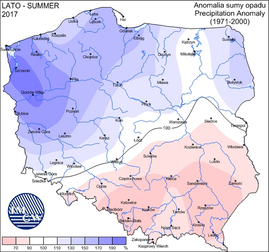 Anomalie temperatury latem 2017 roku. Dane: IMGW-PIB.Na zachodzie i północy kraju lato było mokre. Szczególnie deszczowo było na zachodnim Pomorzu i Ziemi Lubuskiej, gdzie norma opadów została przekroczona niemal dwukrotnie. Zupełnie inaczej lato zapamiętają mieszkańcy południa i południowego wschodu, gdzie było sucho, bo spadło około 70 procent sezonowej normy deszczu.