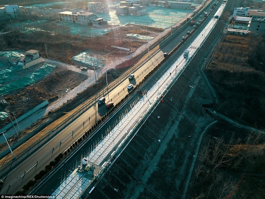 Budowa największej na świecie solarnej drogi w Chinach. Fot. ImagineChina.Solarna autostrada nie tylko będzie dostarczała energię elektryczną na potrzeby jej oświetlenia w nocy, ale również do pobliskich domów, a nagrzewające się panele będą przyspieszały topnienie śniegu w zimie, co jest bardzo praktycznym rozwiązaniem.
