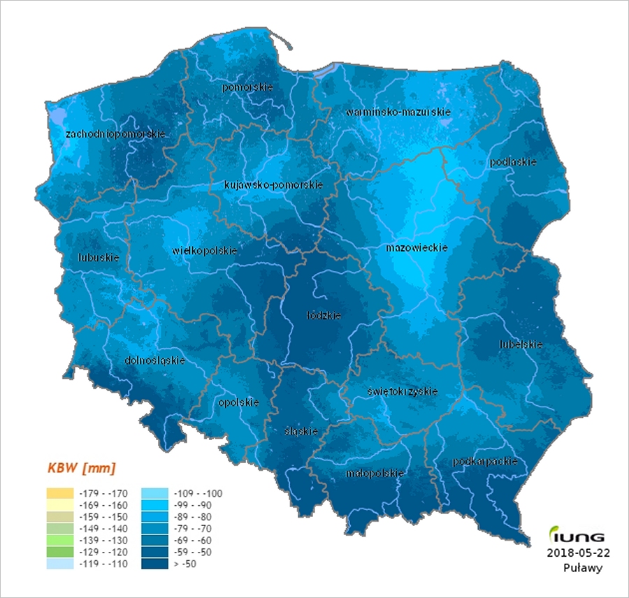 Wskaźnik Klimatycznego Bilansu Wodnego w okresie 21 marca - 21 maja 2018 roku. Dane: IUNG.W pierwszym okresie raportowania, od 21 marca do 21 maja 2018 roku, nie stwierdzono wystąpienia suszy rolniczej na obszarze Polski. Wartości Klimatycznego Bilansu Wodnego (KBW), na podstawie których dokonywana jest ocena stanu zagrożenia suszą, są na większości obszarów Polski ujemne.