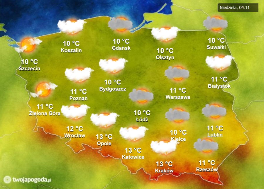 Niedziela (4.11) opadów już nie przyniesie, a niebo będzie się wreszcie przejaśniać i rozpogadzać. Temperatura jednak utrzyma się na poziomie około 10 stopni. Cieplejsze powietrze gościć będzie na Śląsku, w Małopolsce i na Podkarpaciu, gdzie odnotujemy 12-13 stopni.