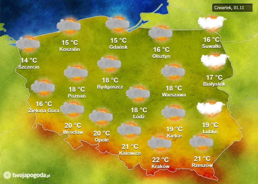 Jeśli więc nie chcecie udawać się na groby bliskich w tłoczny 1 listopada, możecie pomyśleć o niedzieli, która zapowiada się równie pogodnie i sucho, choć dużo chłodniej, wciąż jednak powyżej normy wieloletniej dla pierwszych dni listopada.