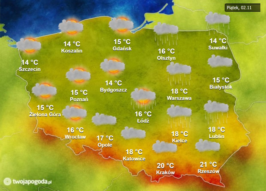 Termometry pokażą od 15-17 stopni na północy i zachodzie do 18-20 stopni na południu i w centrum. Lokalnie na Śląsku, w Małopolsce i na Podkarpaciu będzie jeszcze cieplej, nawet powyżej 20 stopni w cieniu.