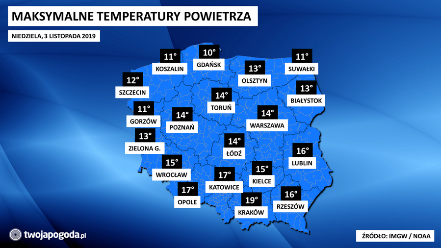 Na tym obszarze, na którym znalazł się m.in. Kraków, niebo było nie tylko wolne od chmur i lazurowe, ale też słoneczko całkiem przyjemnie grzało. Temperatura poszybowała osiągając nietypowe wartości, jak na początek listopada. W stolicy Małopolski zmierzono aż 19 stopni.