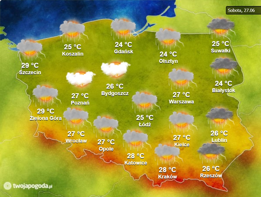 W całym kraju będzie gorąco, a w strefie opadów i burz także wilgotno, parno i duszno. Termometry pokażą maksymalnie od 24 stopni na północy i północnym wschodzie do 29 stopni na zachodzie kraju. Podczas burz temperatura może spaść nawet o 10 stopni w ciągu kilkudziesięciu minut.