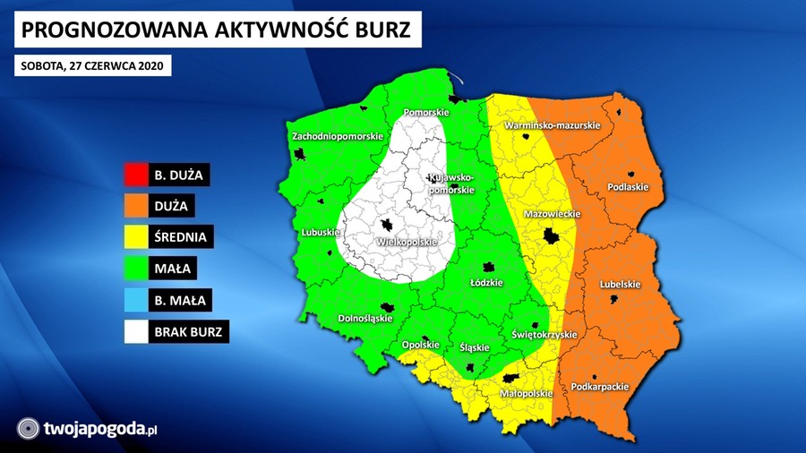 W sobotę (27.06) burz spodziewamy się w wielu regionach kraju, jednak te najbardziej gwałtowne i zarazem niebezpieczne zjawiska wystąpią tym razem w województwach wschodnich, z apogeum na Lubelszczyźnie i Podkarpaciu.