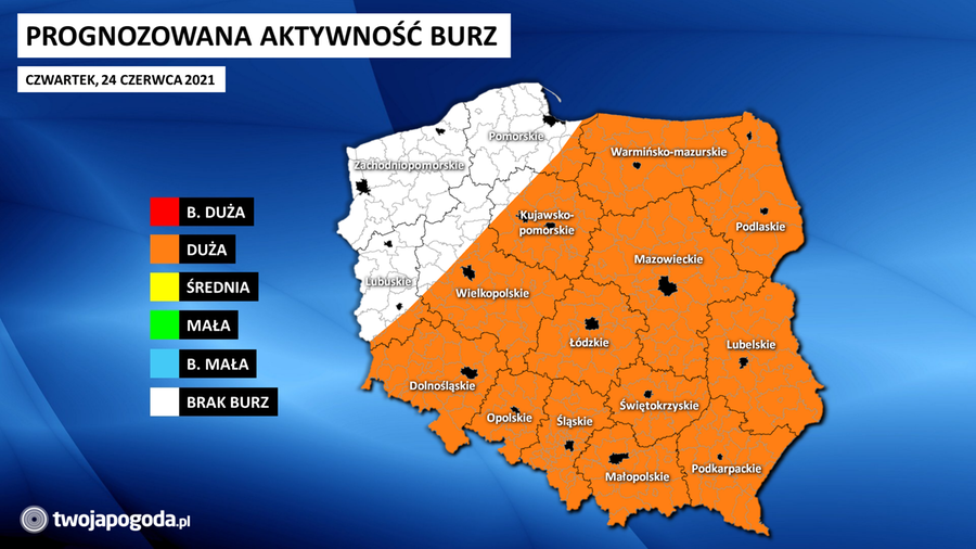 W czwartek (24.06) już od godzin wczesno porannych burze, miejscami gwałtowne, spodziewane są na Śląsku i w Wielkopolsce. Przed południem dotrą one nad Ziemię Łódzką i Mazowsze, a po południu sięgną Kujaw, Pomorza Gdańskiego, Warmii, Mazur i Podlasia.