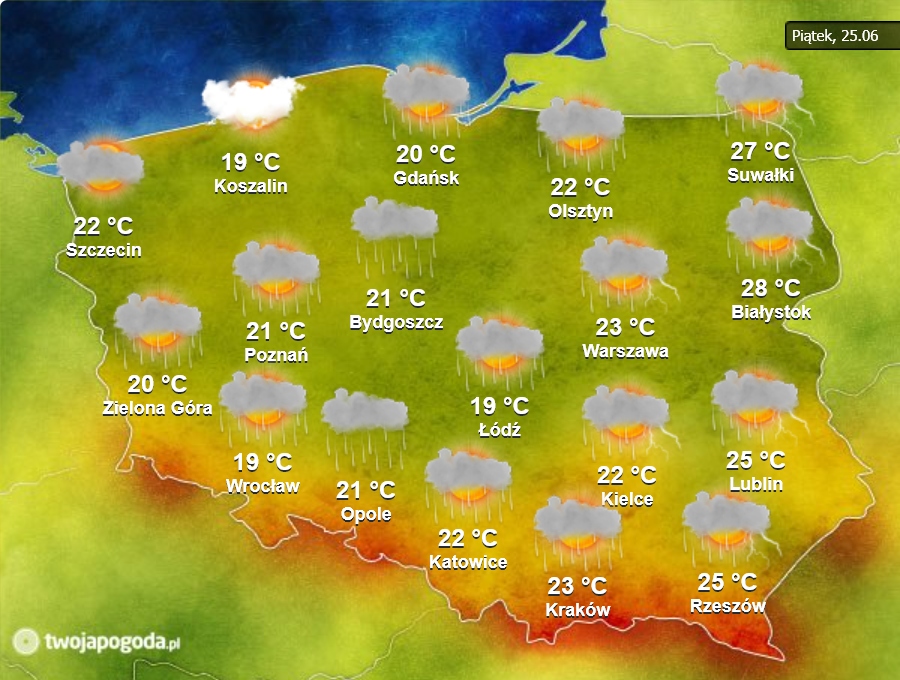 Prognoza pogody na piątek. Fot. TwojaPogoda.plNajbardziej niebezpiecznie (burze, ulewy, gradobicia, wichury i upał) będzie w następnych dniach na wschodzie i południowym wschodzie, zaś najspokojniej (słonecznie, sucho i chłodno) na północnym zachodzie.
