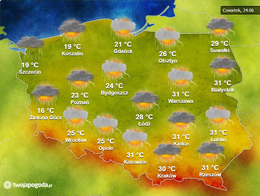 W czwartek (24.06) już od godzin wczesno porannych burze, miejscami gwałtowne, spodziewane są na Śląsku i w Wielkopolsce. Przed południem dotrą one nad Ziemię Łódzką i Mazowsze, a po południu sięgną Kujaw, Pomorza Gdańskiego, Warmii, Mazur i Podlasia.