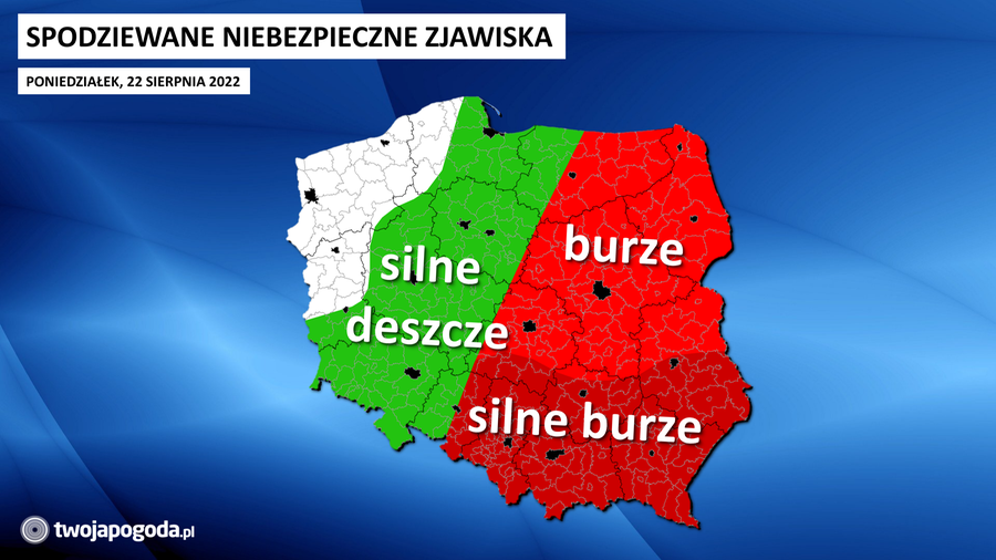 Najbardziej intensywne burze przejdą nad województwami południowymi, gdzie sumy opadów w krótkim czasie mogą dochodzić do 50 mm, lokalnie z gradem do 5 cm i porywami wiatru do 100 km/h. Możliwe są nagłe wezbrania rzek i podtopień, zwłaszcza w Karpatach.