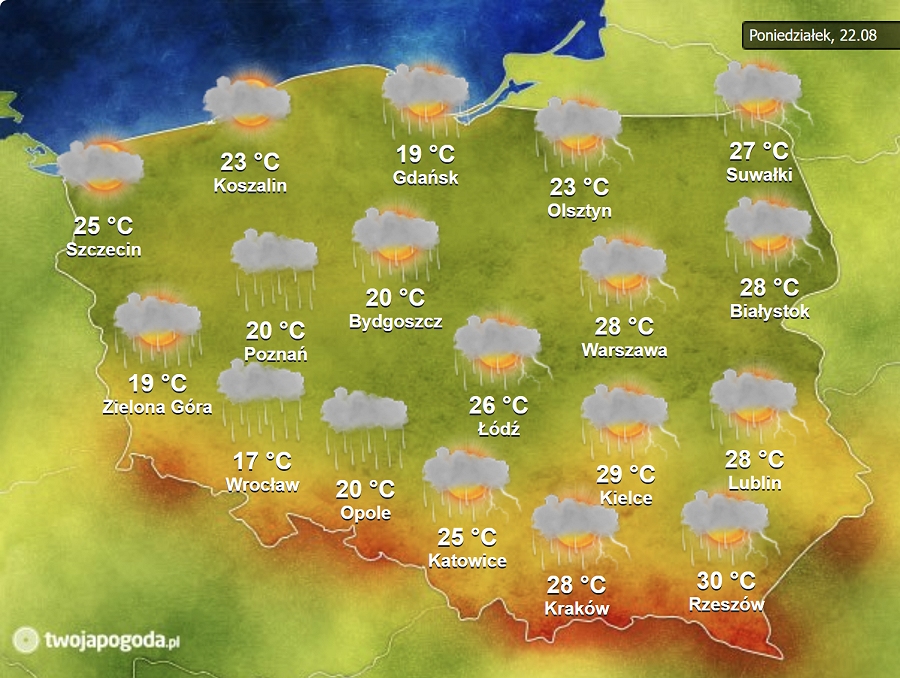 Na południu, wschodzie i w centrum po większych przejaśnieniach i rozpogodzeniach, w drugiej połowie dnia zacznie się chmurzyć, a miejscami przejdą burze z gradem i porywistym wiatrem. Może spaść do 30 mm deszczu, grad o średnicy 3 cm, a porywy wiatru sięgną 90 km/h.
