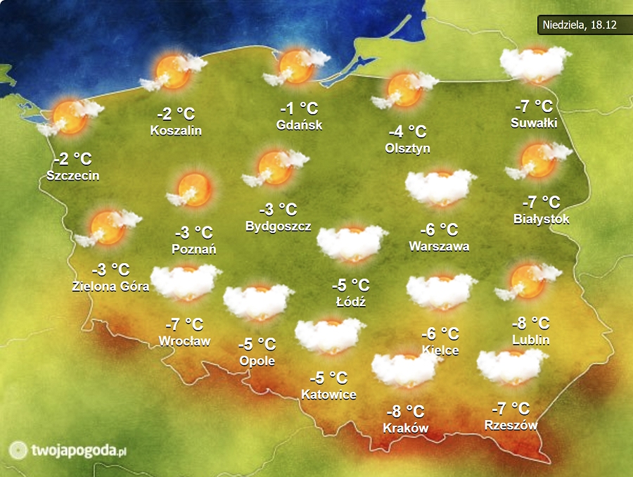 W niedzielę (18.12) większe rozpogodzenia utrzymają się w regionach zachodnich i północnych. Na południu, wschodzie i w centrum chmur więcej, ale z przejaśnieniami. Padać nie powinno.