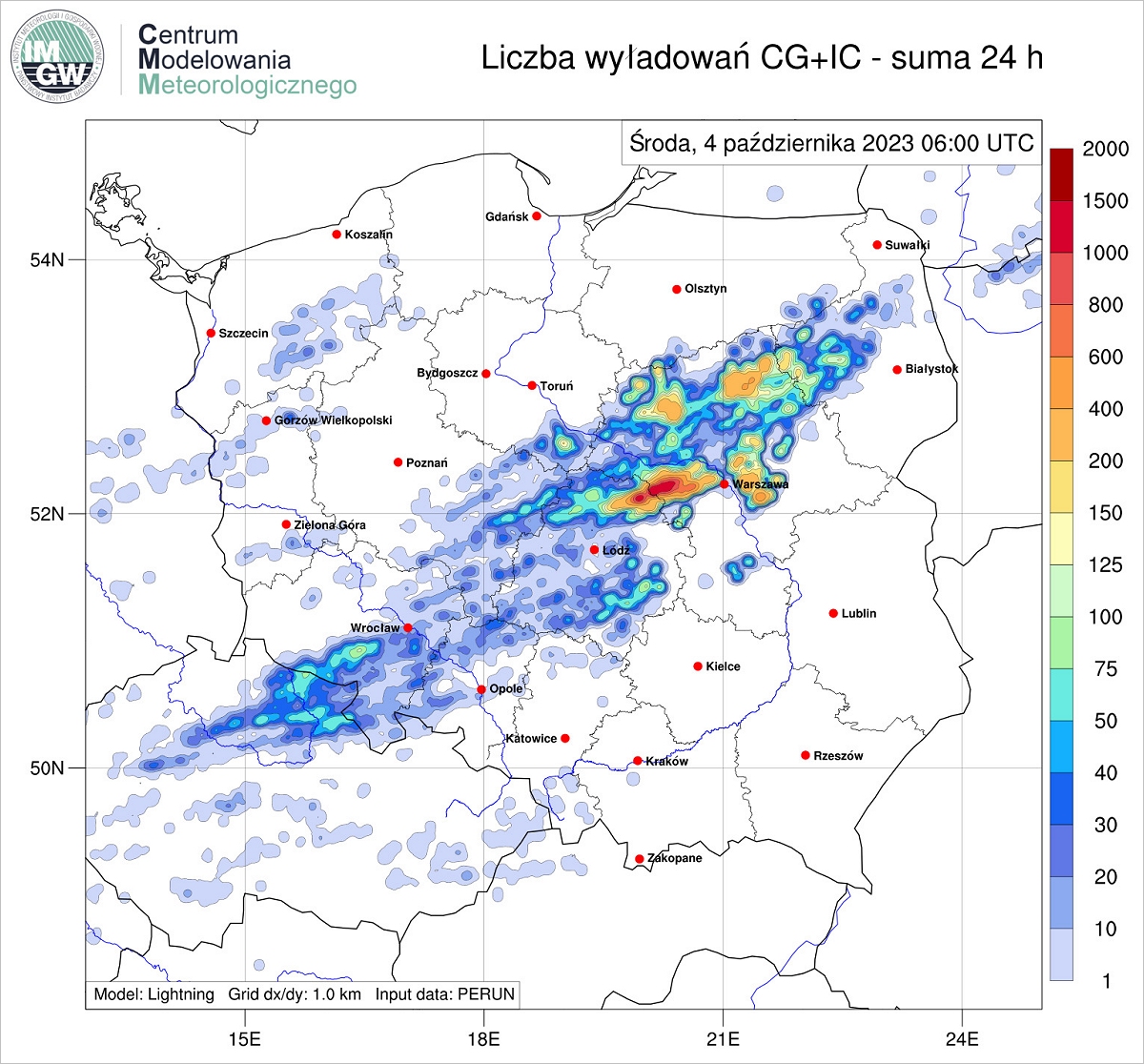 Kilka tysięcy piorunów przecięło niebo nad Polską w nocy z wtorku na środę (3/4.10), gdy z zachodu na wschód kraju wędrował chłodny front atmosferyczny kończący rekordowo wysokie jak na październik temperatury.