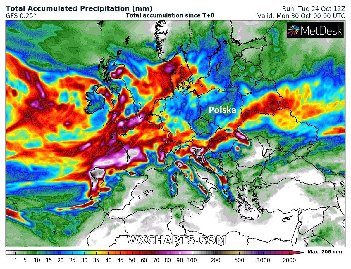 Sumy opadów (w mm) do końca tygodnia według modelu GFS. Fot. Wxcharts.comJednak takich układów jest znacznie więcej i do końca tygodnia będą one przynosić na przeważającym obszarze kontynentu deszcze. Tych najbardziej intensywnych spodziewamy się ponownie od Wysp Brytyjskich przez Francję po Hiszpanię i Portugalię.