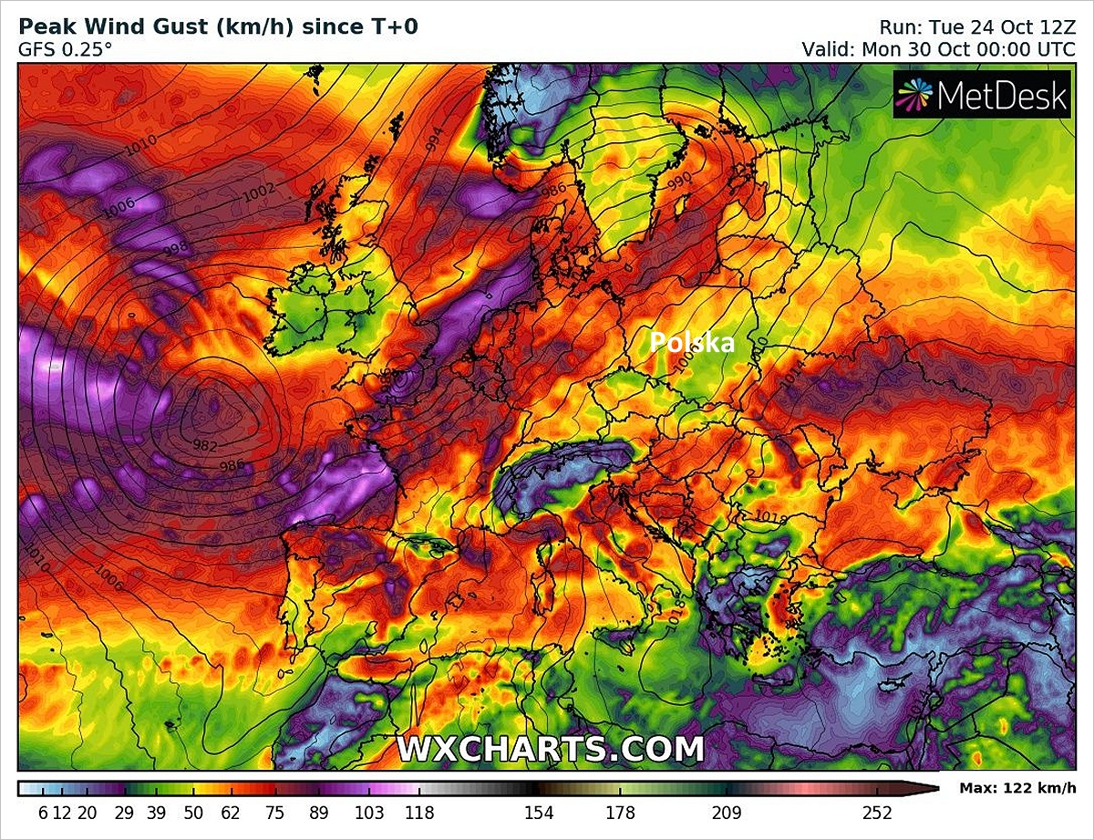 Porywy wiatru (w km/h) do końca tygodnia według modelu GFS. Fot. Wxcharts.comGłębokie niże to również zagrożenie porywistym wiatrem. Rzadko kiedy tak znaczny obszar Europy będzie przeżywać wichury. Szczególnie dotknięte będą regiony zachodnie, ale też południowe i wschodnie.