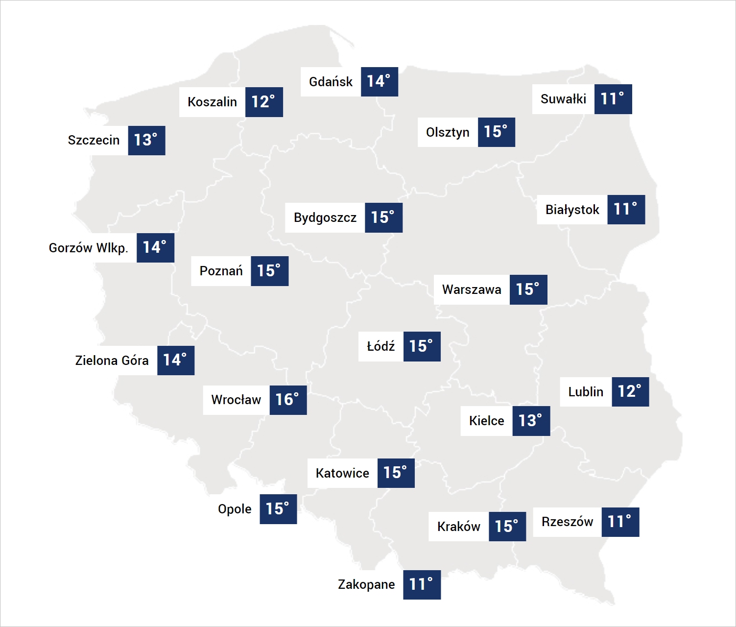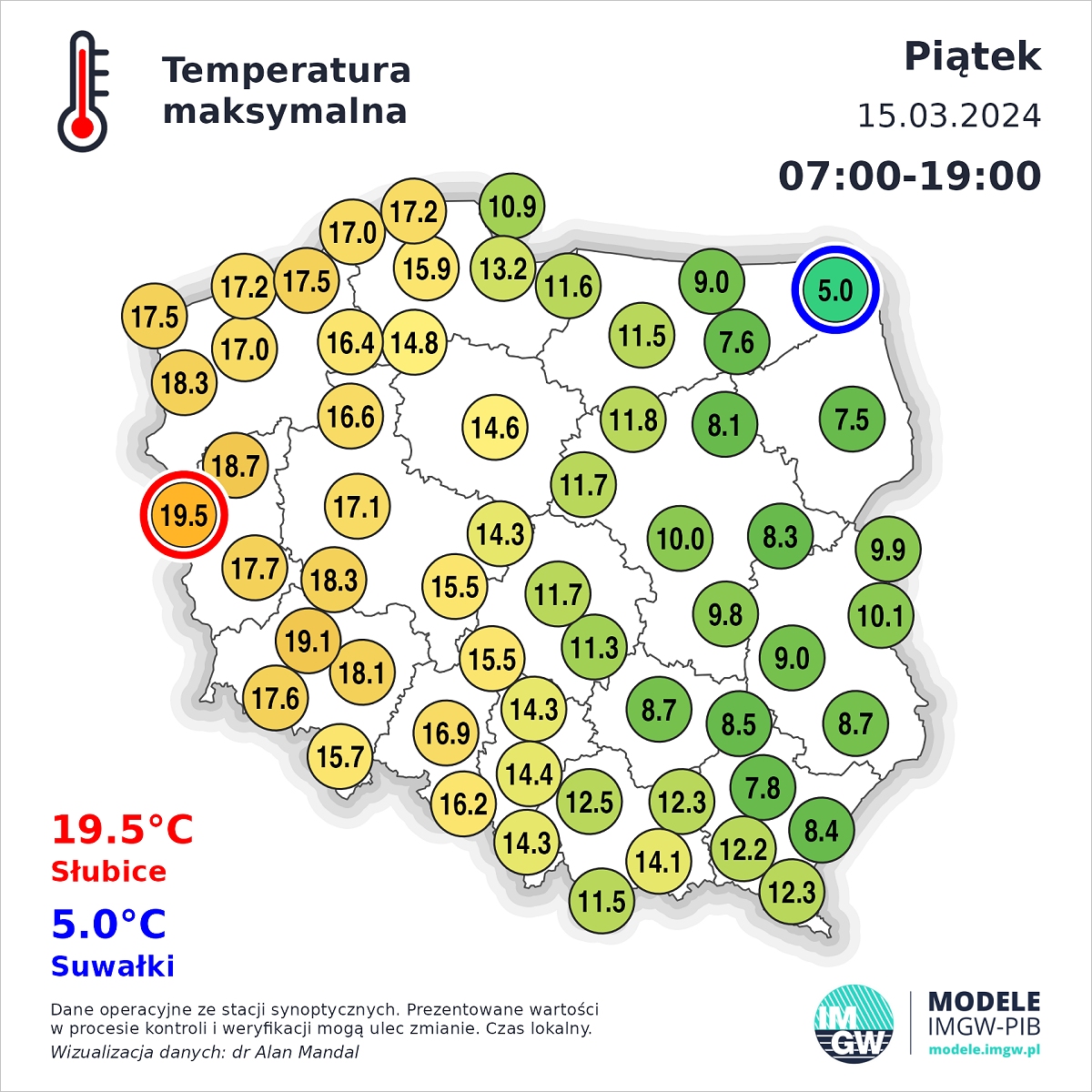 Bardzo ciepło było w całej zachodniej części kraju, przeważnie powyżej 15 stopni. Temperaturę odczuwalną podnosiło promieniowanie słoneczne, ponieważ pojawiły się większe przejaśnienia i rozpogodzenia.