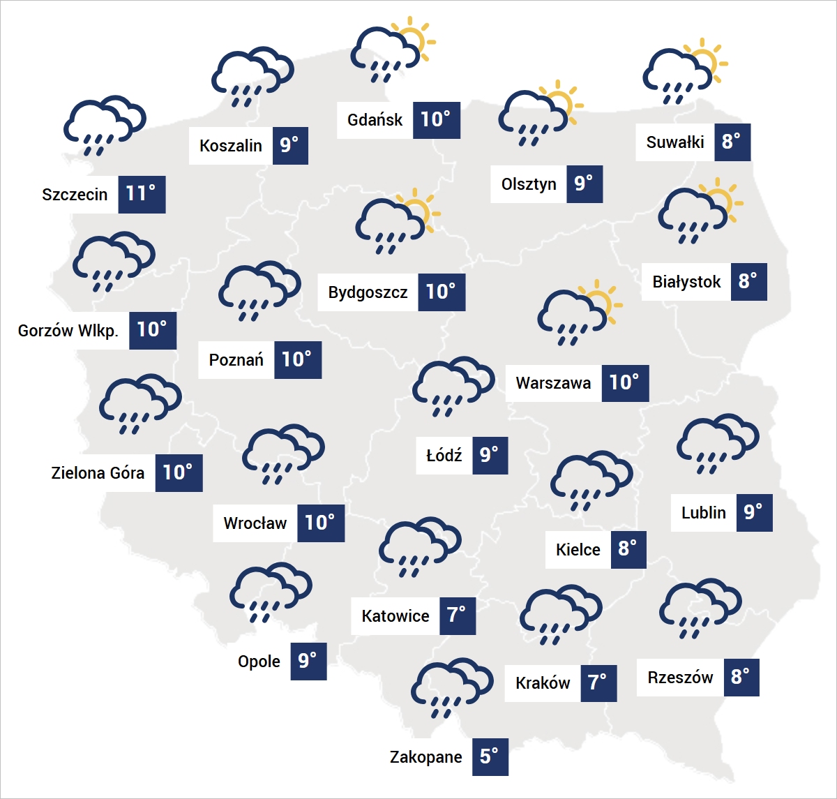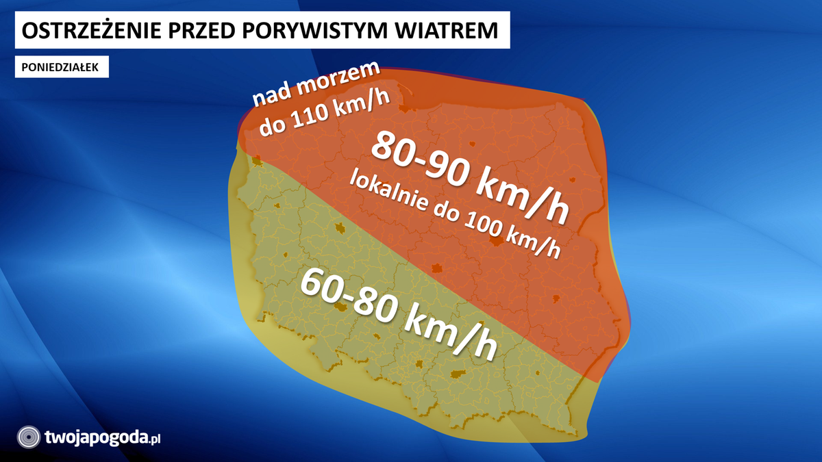 Bardzo mocno wiać będzie przez cały dzień. Na zachodzie i południu kraju porywy zachodniego wiatru osiągać będą do 70-80 km/h. Znacznie silniejszego wiatru spodziewamy się na wschodzie, północy i w centrum, nawet do 80-100 km/h, a nad morzem do 100-110 km/h.