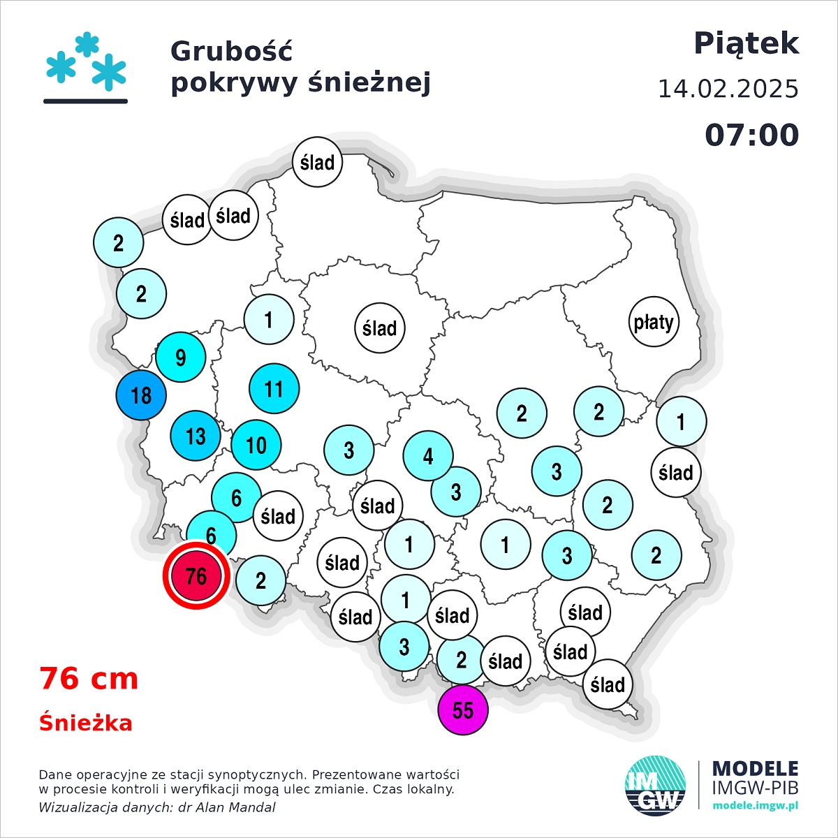Ostatniej doby śnieg prószył na ponad połowie obszaru Polski, jednak nie wszędzie z podobną intensywnością. Przeważnie spadło od 1 do 3 centymetrów świeżego puchu, ale na północy i północnym wschodzie ani płatka.