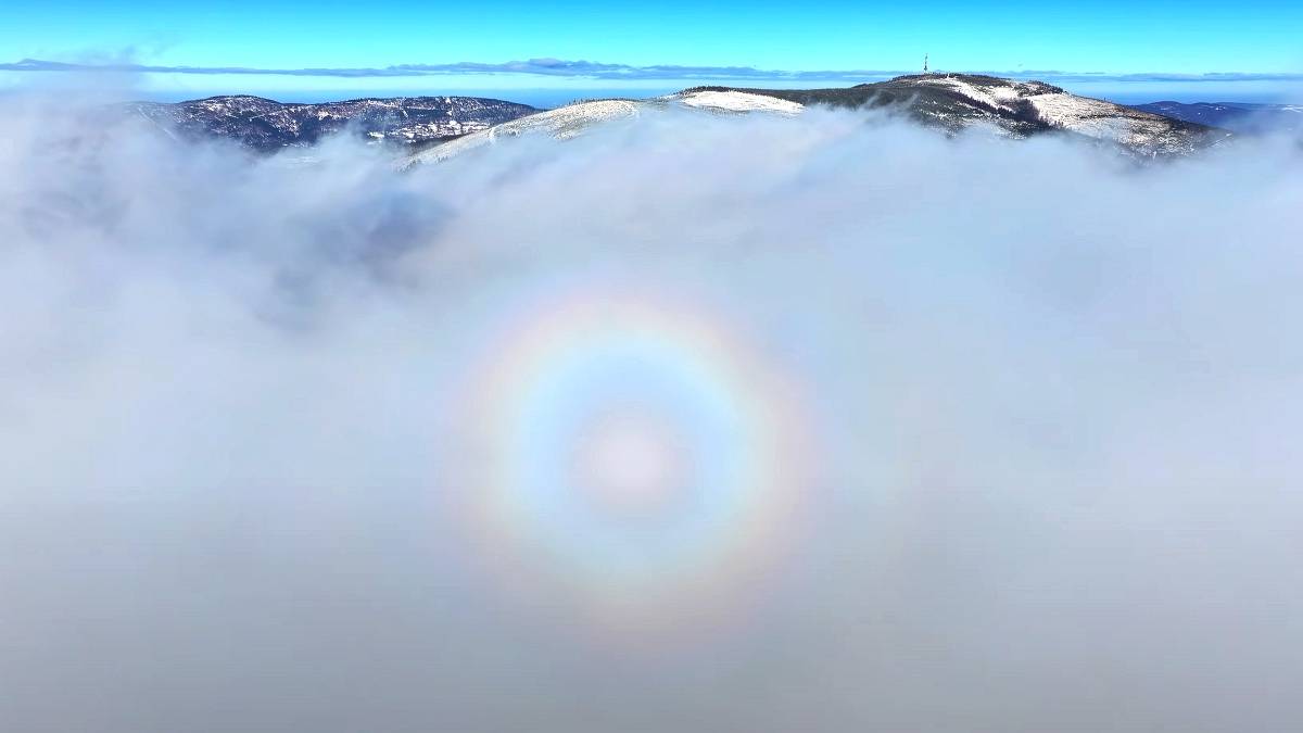 Tym razem fenomen ten pojawił się na tle morza chmur, z którego wyłonił się masyw Skrzycznego, najwyższej góry w Beskidzie Śląskim. To tęczowa aureola otaczająca cień drona, z którego omawiane zdjęcie powstało.