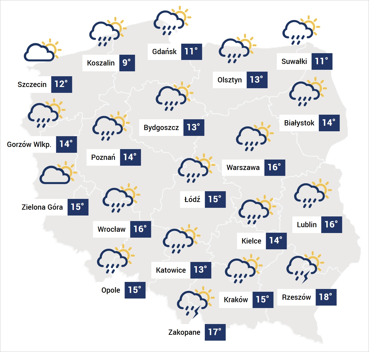 Przyczyną będzie wędrówka chłodnego frontu atmosferycznego, który przyniesie przelotne deszcze, które w wielu miejscach będą połączone z burzami, również gwałtownymi, a wówczas opady mogą być ulewne, z gradem i porywistym wiatrem.