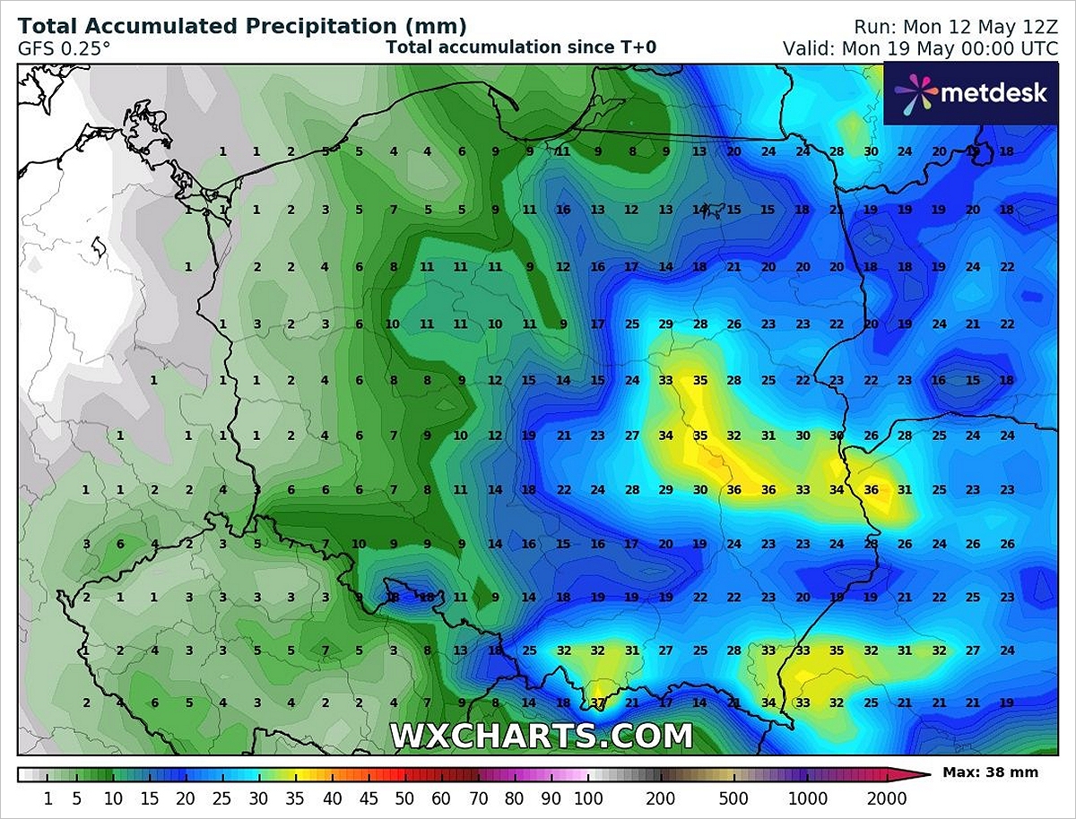 Sumy opadów (w litrach na metr kwadratowy) prognozowane do końca tygodnia. Fot. wxcharts.comChociaż deszcz powoduje sporo problemów, to jednak jest podczas panującej suszy niezwykle potrzebny, w każdych ilościach. Do końca tygodnia spadnie go najwięcej na wschodzie, południu i w centrum, przeważnie od 10 do 30 litrów na metr kwadratowy, a lokalnie nawet do 40 litrów.