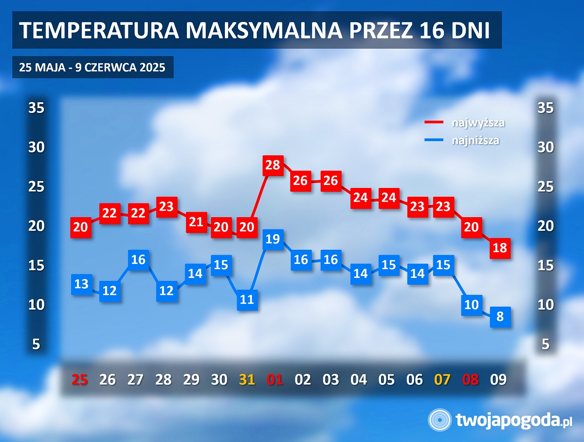 Jedynie przełom maja i czerwca przyniesie nam nagłe, ale też krótkie ocieplenie. Temperatura skoczy powyżej 25 stopni, chociaż w chłodniejszych regionach nadal będzie poniżej 20 stopni. Następne dni zamiast coraz cieplejsze, wręcz przeciwnie, będą nieść nasilające się ochłodzenie.