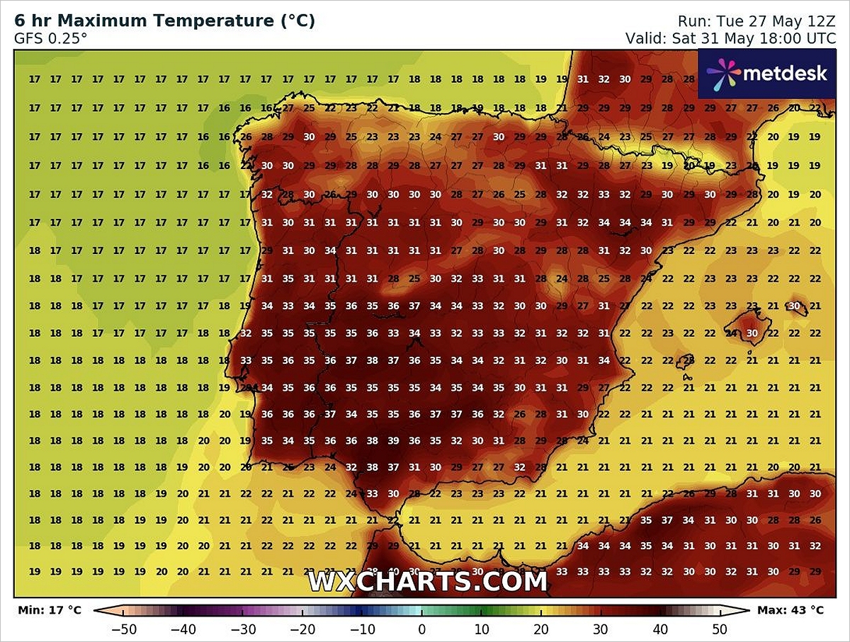 Jednak do nas dotrze zaledwie końcówka jęzora gorącego powietrza. Jego główna część znajdzie się nad Półwyspem Iberyjskim, skąd rozgrzana, upalna masa będzie docierać znad zachodniej Sahary. Największy żar będzie panować w Andaluzji, na południu Hiszpanii.