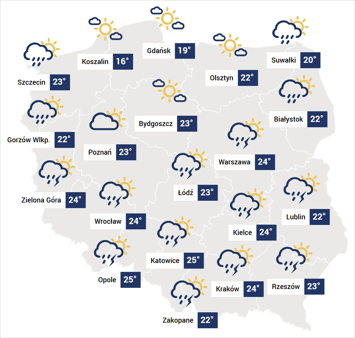 Niemal wszędzie, jedynie poza krańcami północnymi, termometry pokażą powyżej 20 stopni. Najcieplej będzie miejscami na zachodzie i południu, gdzie temperatura sięgnie w cieniu nawet 26-27 stopni. Tuż po opadach i burzach będzie nieprzyjemnie parno.
