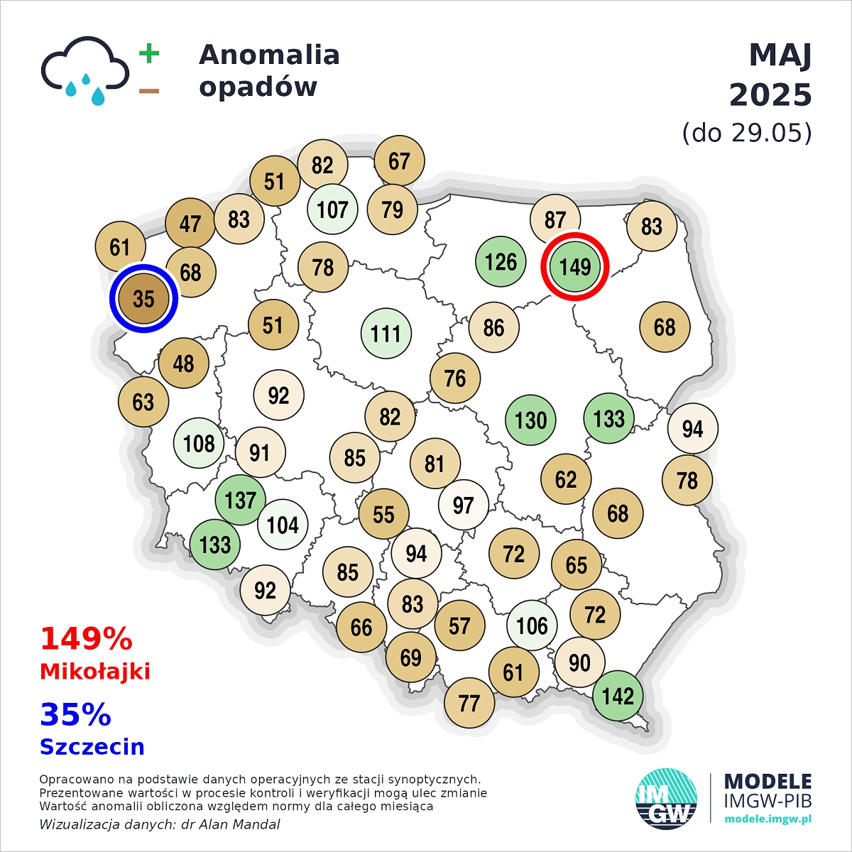 Anomalie opadów od 1 do 29 maja 2025. Fot. IMGW-PIB.Na większym obszarze kraju sumy opadów oscylowały poniżej normy, na północnym zachodzie nie przekraczając miejscami 35 procent majowej normy. Tylko lokalnie były obfite, zwłaszcza tam, gdzie wielokrotnie przechodziły deszcze konwekcyjne. Tam norma została przekroczona nawet o połowę.