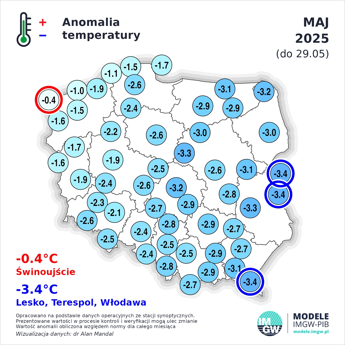 Anomalie temperatury od 1 do 29 maja 2025. Fot. IMGW-PIB.Praktycznie przez cały maj zmagaliśmy się z nocnymi i porannymi przymrozkami, które miejscami okazywały się imponujące, a przez to wyjątkowo pustoszące dla upraw. Temperatura potrafiła spaść lokalnie do minus 5 stopni, a przy gruncie nawet do minus 10 stopni.