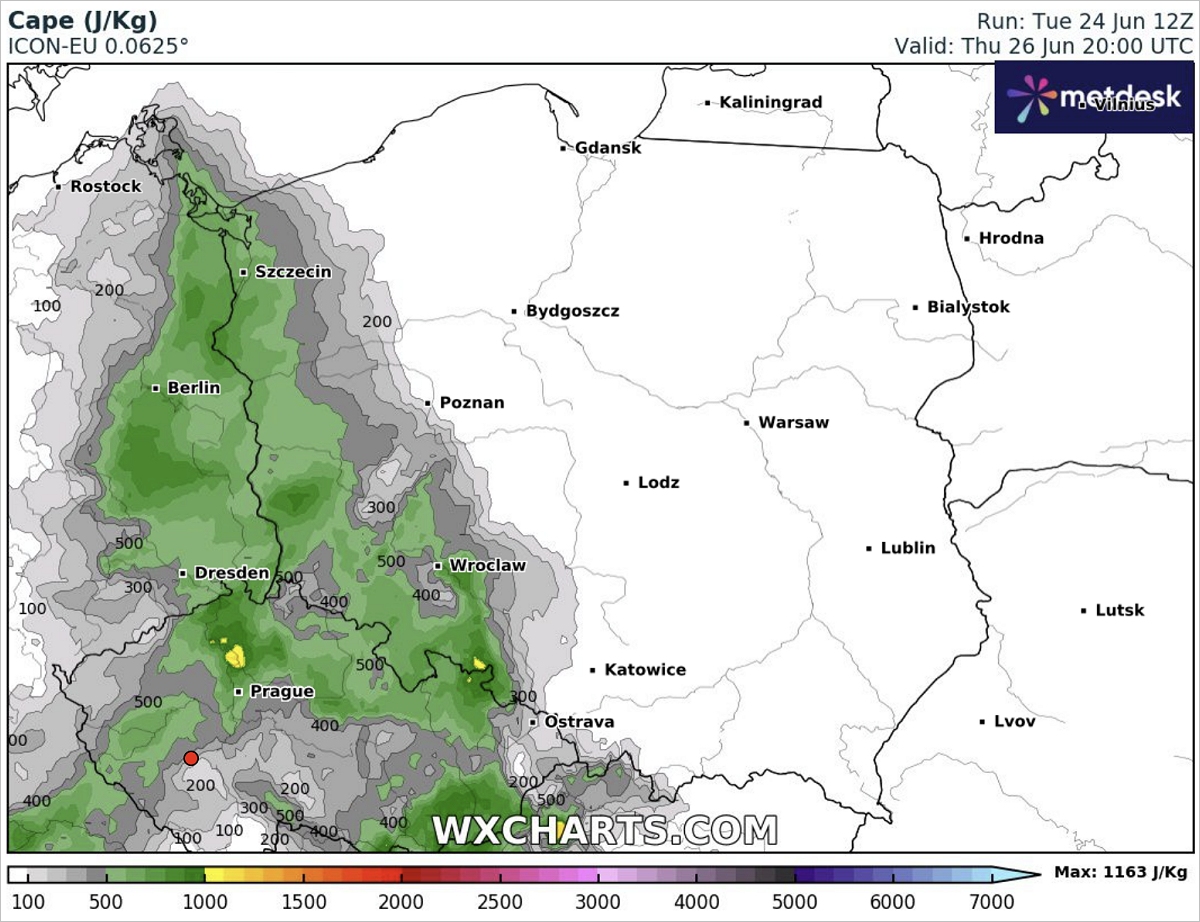 Jednak tych najbardziej niebezpiecznych burz, bo związanych z aktywnym frontem chłodnym, spodziewamy się w czwartek (26.06) w drugiej połowie dnia. Uderzą one krótko po tym, gdy na zachodzie i południowym zachodzie kraju temperatura sięgnie 30-31 stopni. Tam też ryzyko szkód będzie największe.