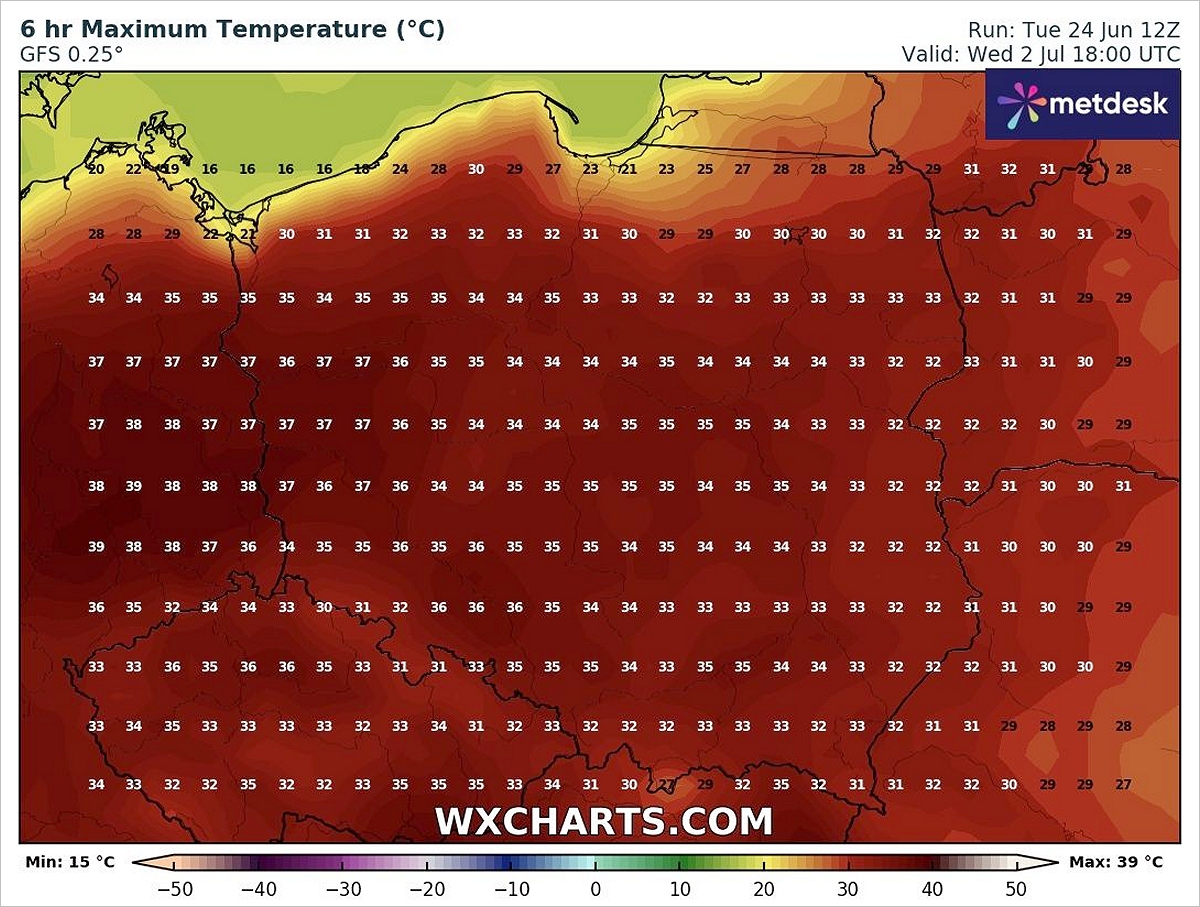 Prognoza maksymalnych temperatur na 2 lipca. Fot. wxcharts.comW sobotę (28.06) upał wróci, tym razem tylko na zachodnie granice. W Słubicach czy Krośnie Odrzańskim termometry pokażą około 30 stopni w cieniu. Na pozostałym obszarze tak gorąco nie będzie, na wschodzie temperatura będzie o całe 10 stopni niższa.