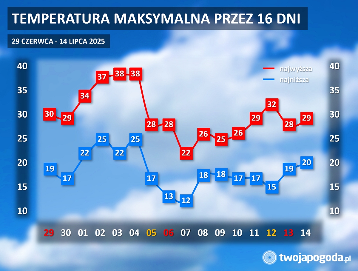 Niestety, trudno jest znaleźć w prognozie długoterminowej dłuższy okres optymalnej pogody. Najpierw będą nam dokuczać upały, później nadejdą burze, a na końcu często będzie padać i porywiście wiać, w dodatku miejscami zrobi się przeszywająco chłodno.