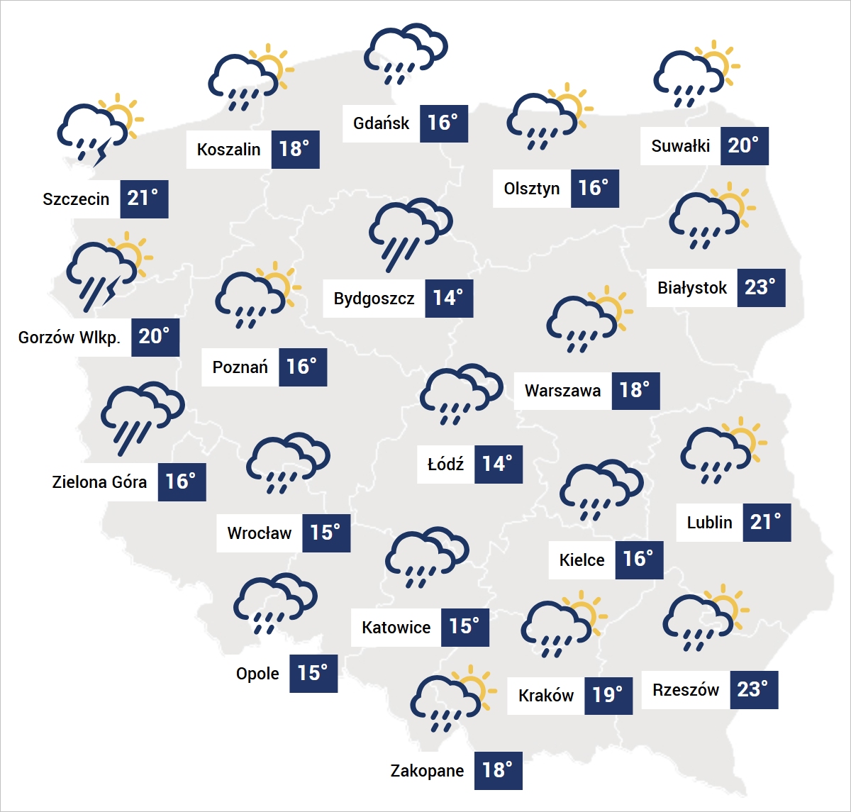 Sobota (12.07) zapowiada się najmniej przyjemnie. Na większym obszarze Polski będzie pochmurno, bez najmniejszych przejaśnień. Słońce nieśmiało będzie się przebijać przez niskie chmury jedynie miejscami na wschodzie i północnym zachodzie.
