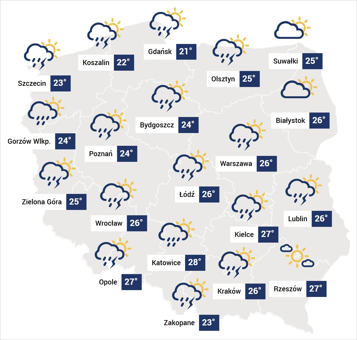 W niedzielę (13.07) zacznie napływać zdecydowanie cieplejsze powietrze, które sprawi, że temperatura wzrośnie na ogół do 24-27 stopni, jedynie nad morzem nieznacznie przekroczy 20 stopni. Będzie parno i duszno.